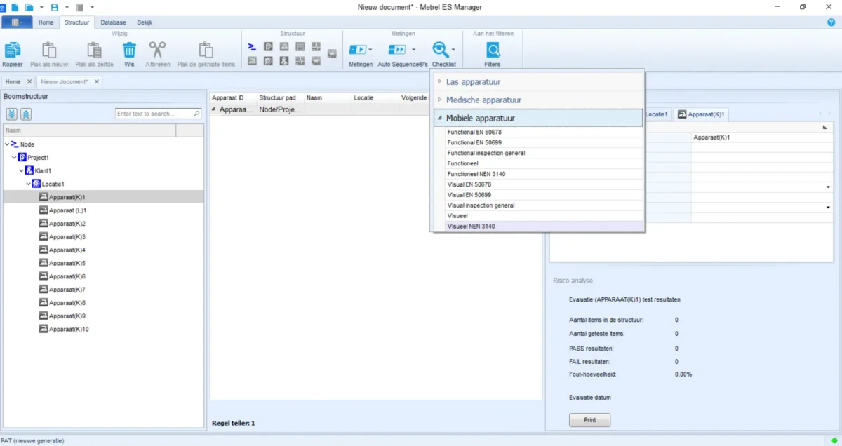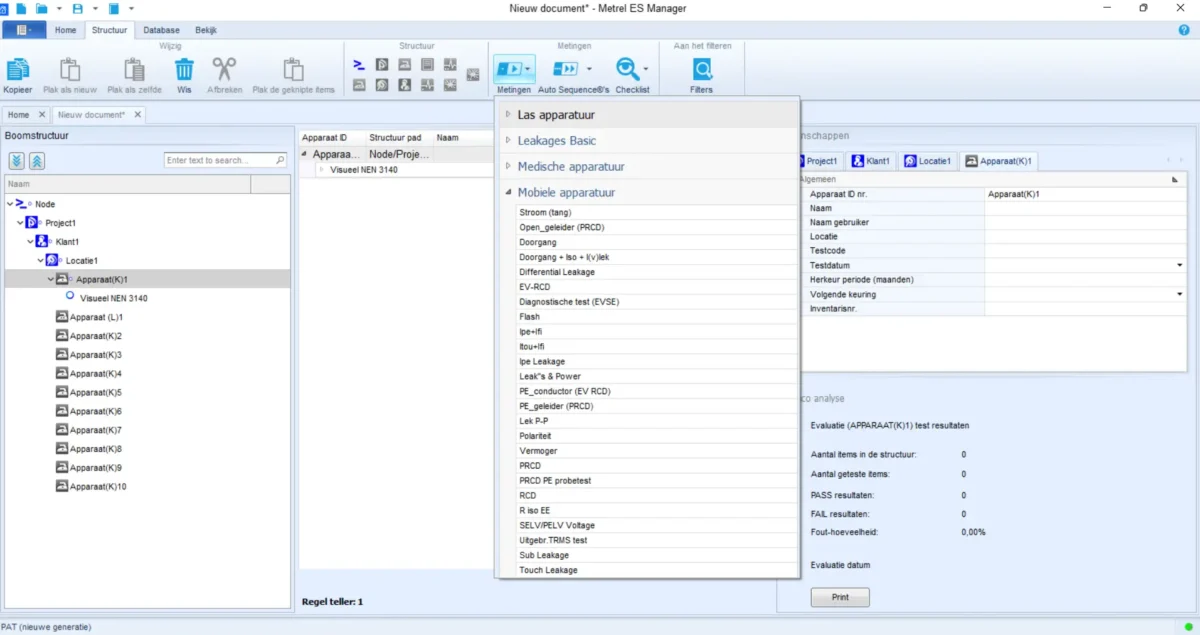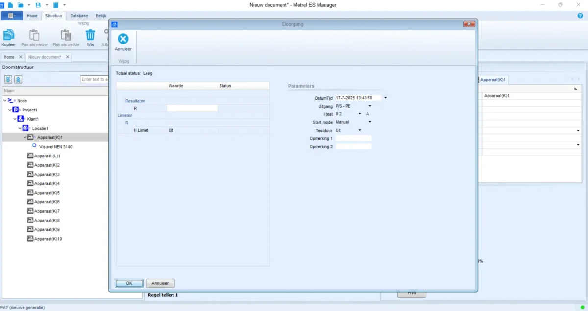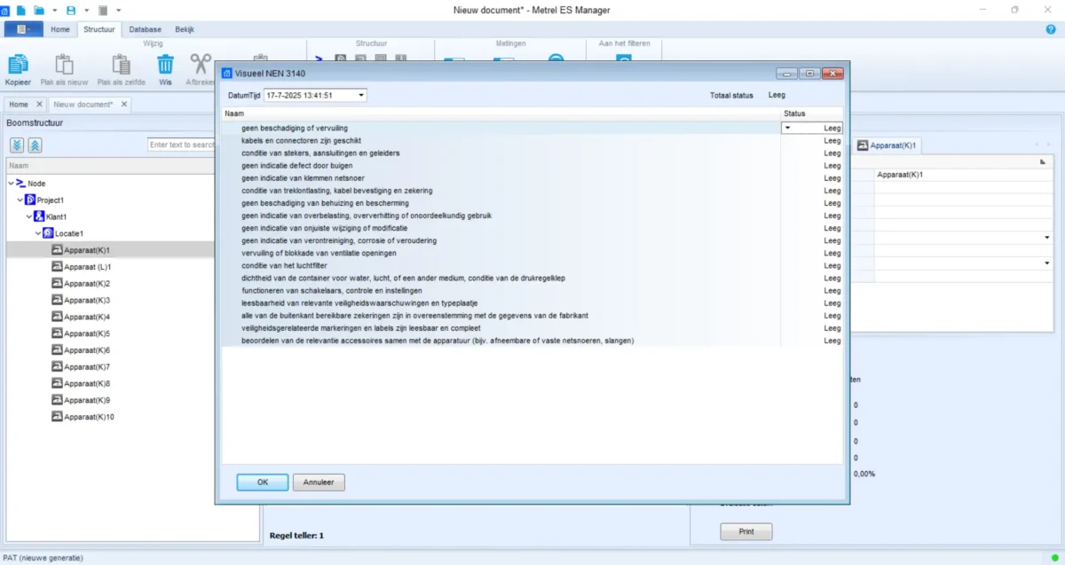 - Voeg metingen toe (dubbelklikken), zoals visuele inspectie, doorgangstest, polariteitstest, risotest, functionele test, etc.