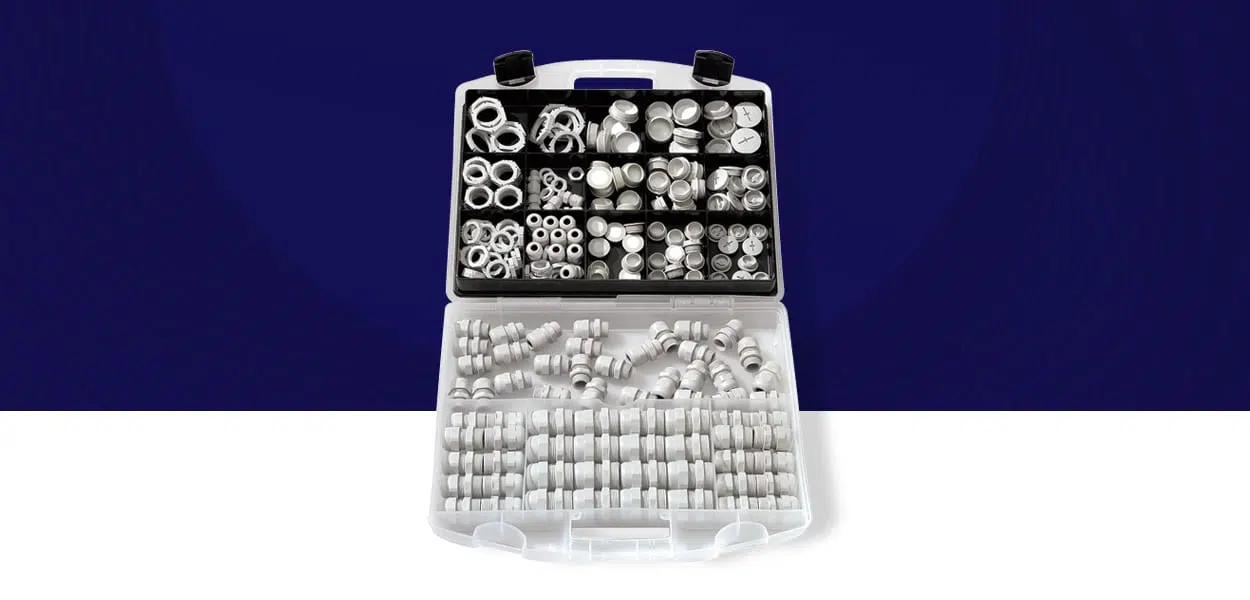 De koffer bevat verschillende maten ESKV kabelwartels, EMUG contramoeren, KRM reduceerringen, KEM vergrotingsringen, EMT membraannippels en EMS schroefbare membraannippels.